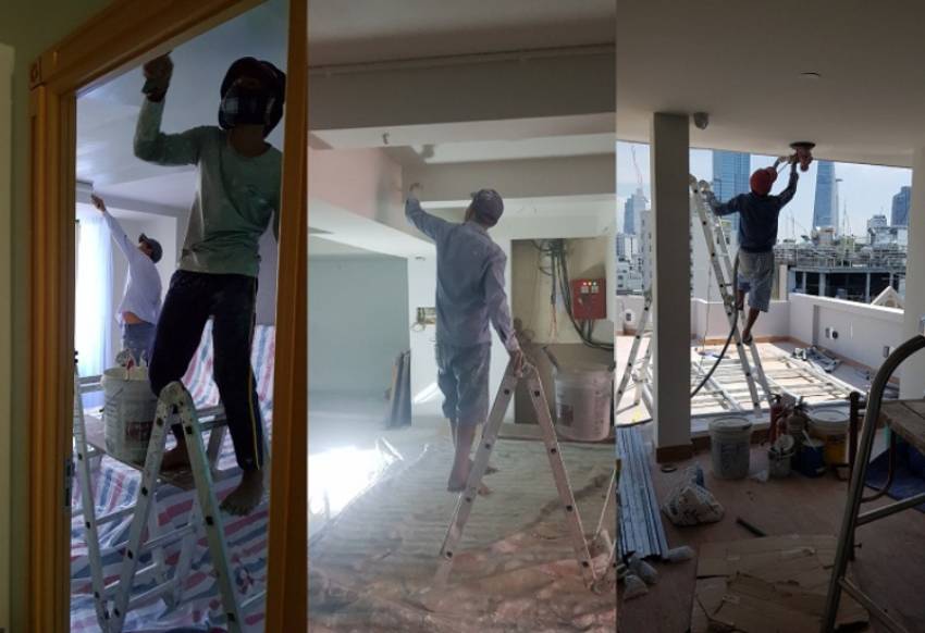 - Bước 1 – Chỉnh sửa bề mặt sơn: Kỹ thuật viên làm sạch bề mặt tường, loại bỏ lớp bụi bẩn, nấm mốc, có thể dùng giấy nhám chà bề mặt tường cho thật mịn.
